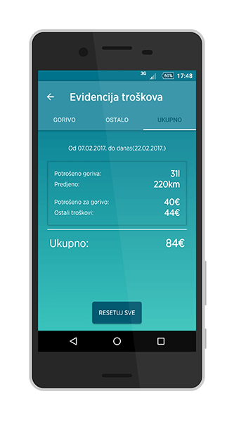 Modul za vođenje dnevnika troškova, kako goriva, tako i svih ostalih troškova koji su u vezi sa vašim vozilom. Kako ovo funkcioniše? Kreirali smo Vaš lični dnevnik potrošnje, koji je vrlo lagan za korišćenje. Imate opciju da vodite evidenciju o potrošenom gorivu i broju kilometara koji ste prešli, i naravno evidenciju o ostalim troškovima na vašem automobilu. Pošto aplikacija zna koje su aktuelne cijene goriva, unos goriva se svodi na klikanje jednog tastera i drugog za čuvanje. Aplikacija računa sve sama, i čuva vaše unose u listi. Na kraju, bitno je napomenuti da postoji pregled ukupne potrošnje kako goriva tako i ostalih troškova, kao total.