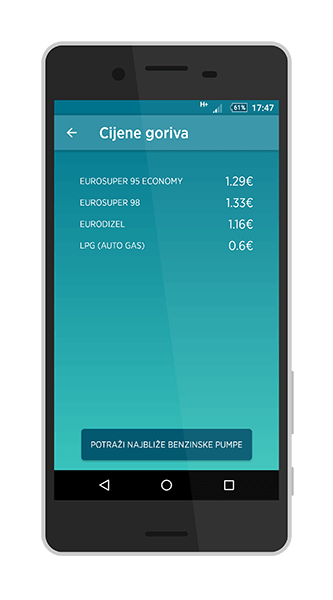 U ovom dijelu aplikacije mogu se naći cijene goriva koje se automatski ažuriraju u skladu sa obračunskim periodima. Takođe, ukoliko je korisniku potrebno da potraži najbližu benzinsku stanicu, aplikacija mu na jedan klik daje spisak najbližih pumpi računajući od njegove trenutne lokacije. Naravno, postoji i mogućnost automatskog vođenja do odabrane pumpe.
