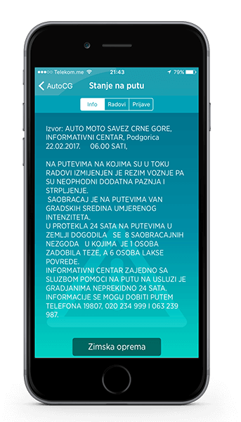 Najsvježije informacije o stanju na putevima koje obezbjeđuje Auto-moto savez Crne Gore. Saradnja sa Auto-moto savezom Crne Gore je ostvarena u smislu dostavljanja informacija o trenutnom stanju na saobraćajnicama, radovima i raznim upozorenjima. Kad god Auto-moto savez objavi nove detalje vezane za stanje na putevima, ti podaci se momentalno ažuriraju u aplikaciji. Takođe, u ovom dijelu aplikacije imamo modul koji omogućava korisnicima da prijave neke karakteristične situacije na putevima. Na primjer odron, gužva, udes, magla i tako dalje. Kada prijava jednom prođe kontrolu naših administratora, i bude odobrena, svi ostali korisnici mogu da je vide. Još jedna vrlo bitna stvar u okviru opcije o stanju na putevima je pregled dionica na kojima je neophodno imati zimsku opremu na automobilu. Pored spiska sa detaljnim objašnjenjima za svaku saobraćajnicu ovog tipa, aplikacija nudi opciju da korisniku na mapi iscrta željenu dionicu u odnosu na njegovu trenuntu lokaciju radi bolje preglednosti.