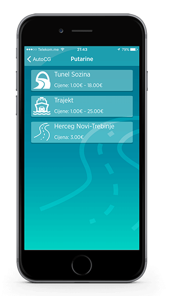Ovaj dio aplikacije nudi informacije o svim saobraćajnim objektima za koje se naplaćuje putarina. To su tunel Sozina, trajekt Kamenari - Lepetane kao i dionica regionalnog puta Herceg Novi - Trebinje. Za svaki od pomenutih objekata navedene su lokacija na mapi, kratak opis, te cjenovnik prikazan na lako razumljiv način.