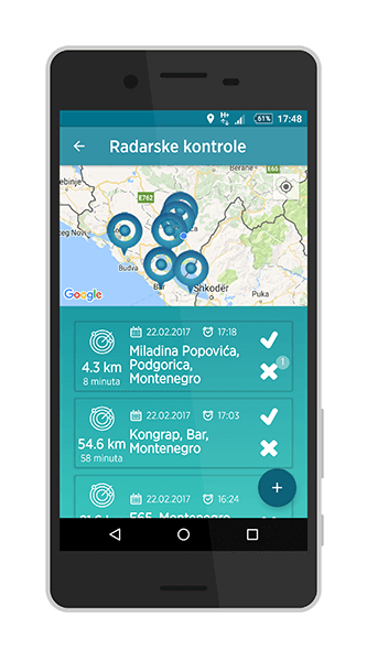 Poseban modul koji nudi prijavu opciju prijave lokacije radarskih kontrola u smislu slanja lokacije korisnika. Nakon odobravanja prijave od strane naših administratora, lokacija kontrole se kod korisnika prikazuje na mapi, a u listi ispod se nalazi tačan opis (ulica, udaljenost u kilometrima i minutima). Kako je ovaj dio aplikacije zamišljen da bude mala društvena mreža, omogućeno je da se svaki radar može ili potvrditi ili demantovati u zavisnosti od toga da li je korsnik zaista vidio kontrolu koja je prijavljena ili ne, klikom na samo jedno dugme.