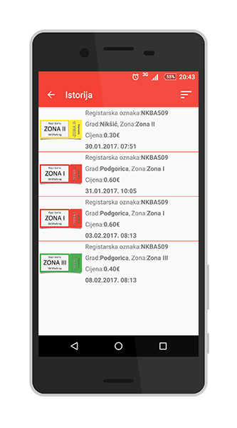 Aplikacija nudi pregled plaćenih karata za parkiranje za sve registarske oznake. Korisniku je ostavljena mogućnost jednostavne pretrage/filtriranja istorije plaćanja, kako bi lakše pronašao kartu koja mu je potrebna. Jedan upis sadrži kartu, registarsku oznaku, mjesto, datum i vrijeme kada je ona plaćena.